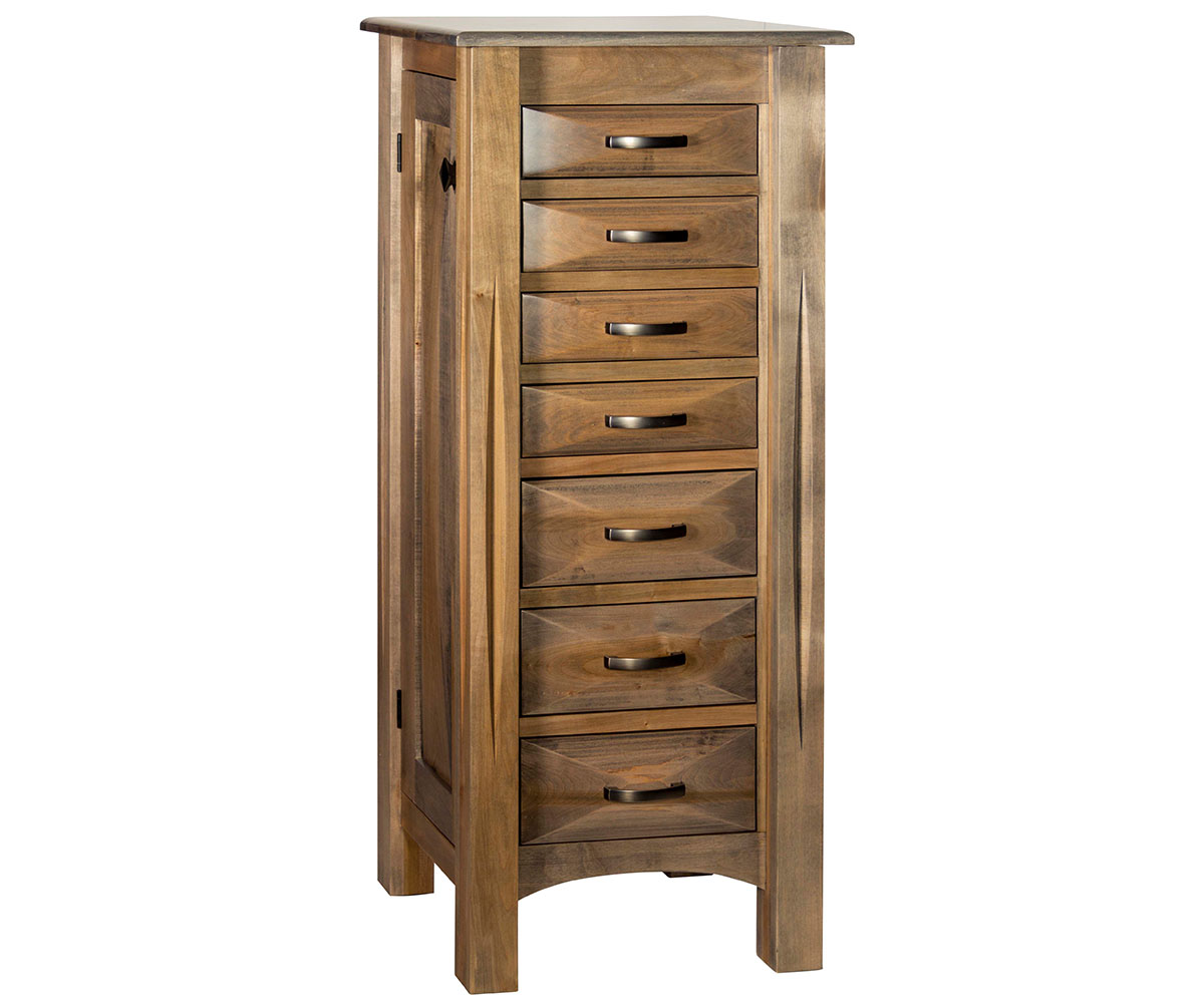 Features: • Black felt lined interiors • Top drawer is a ring drawer • Three divided drawers • Bottom drawers are all felt lined • Necklace storage behind the side doors