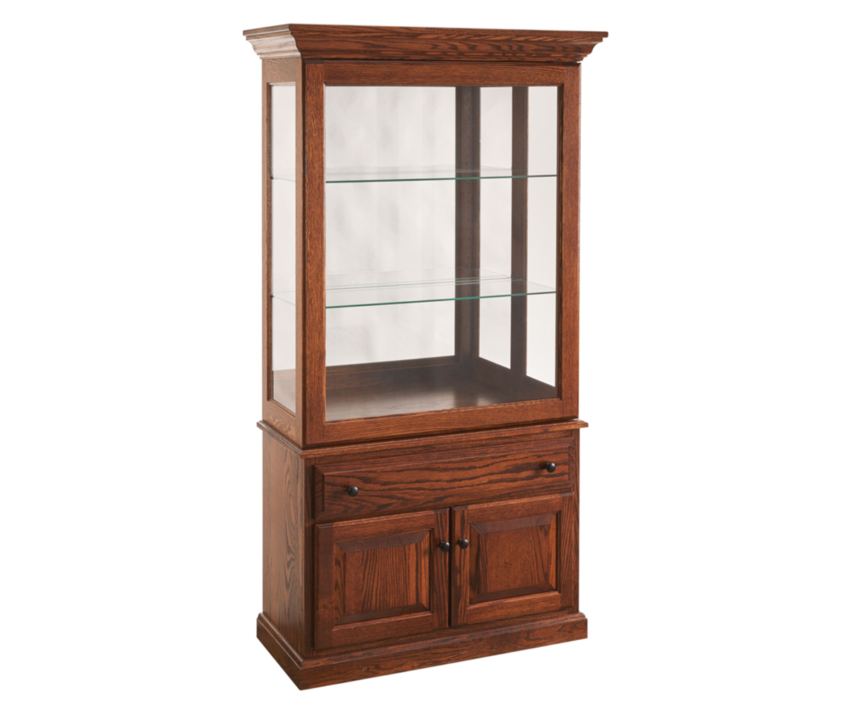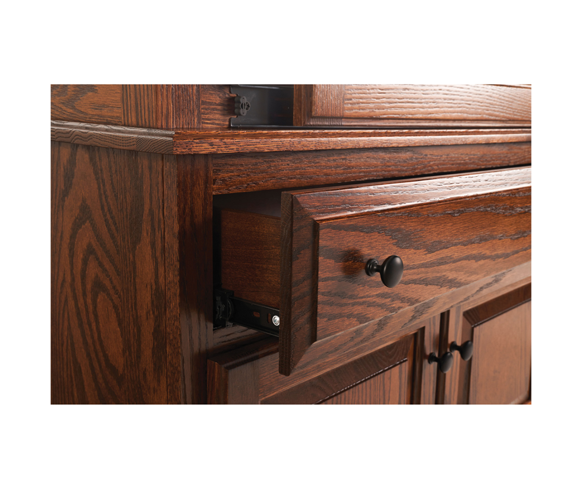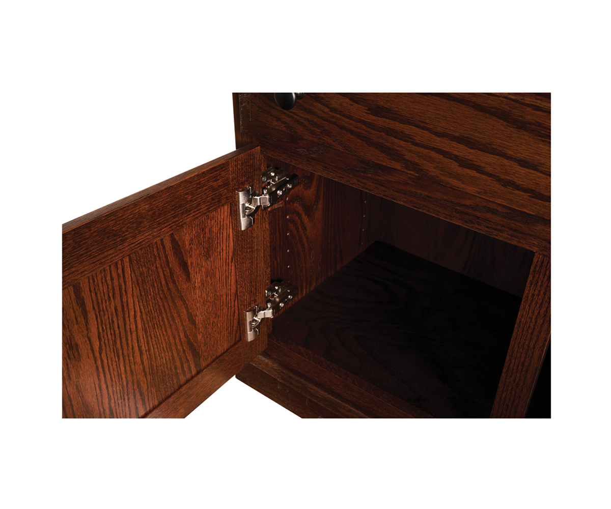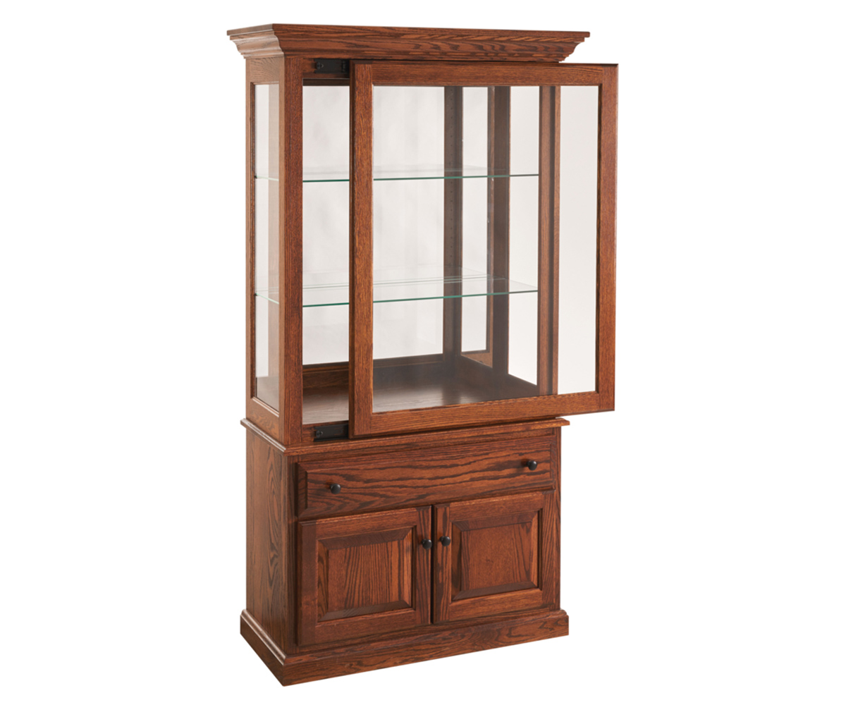 Features: • LED touch light in top of cabinet • Mirror back • Door slides open to the right • Two adjustable glass shelves behind the door • Dovetailed drawer
